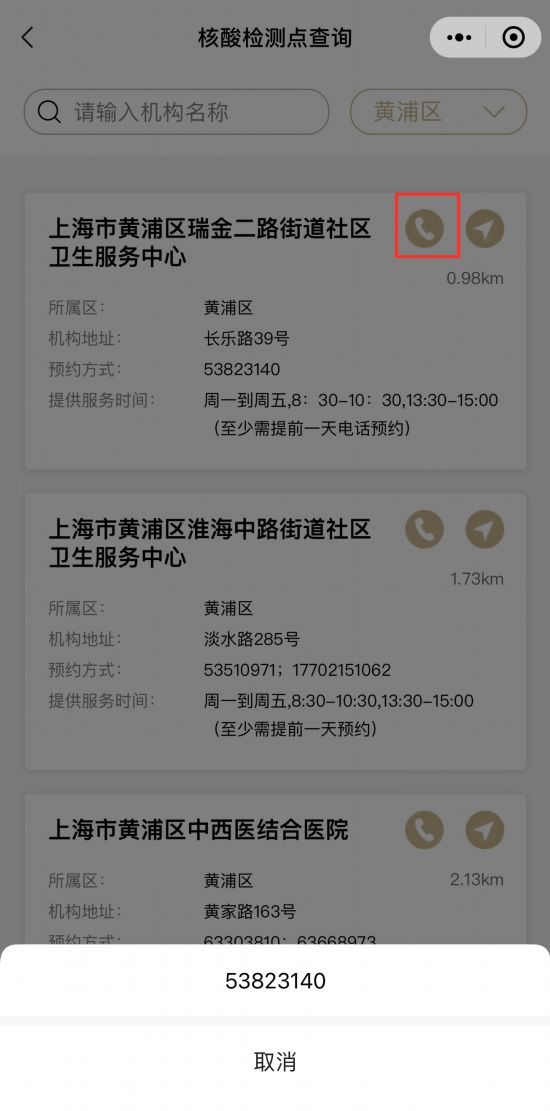 4.在相應的工作時間內,點擊所選檢測點的“小電話”按鈕可直接電話進行核酸檢測預約。