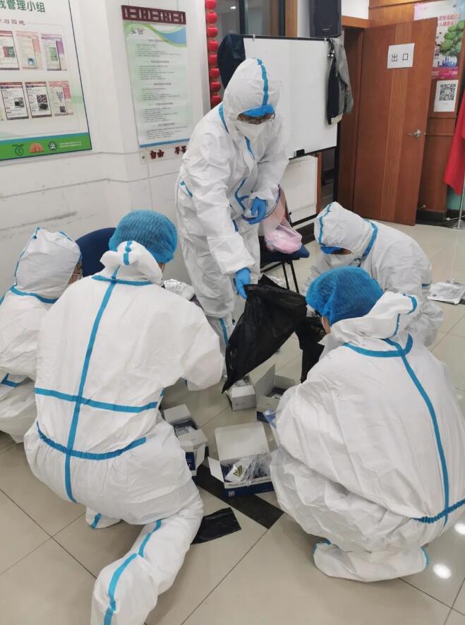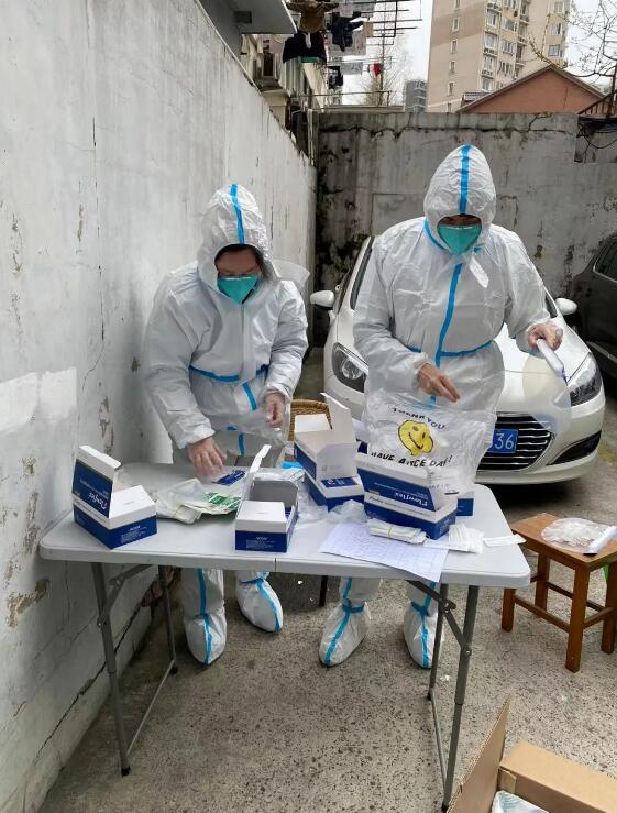 “我負責撐袋子,小劉放說明書,小祝放試劑,小閔、小曹負責核對、打包!”這是采取流水線作業、負責分發試劑的隊伍!澳判,這個檢測結果沒問題”“您手洗過了嗎?洗過的話先用拭子采集鼻部標本,然后……”咨詢點的志愿者們正耐心回答著居民們的問題!澳,我是來發自測試劑的志愿者,請問你們家有幾個人?”負責分發試劑的志愿者們跑上跑下,已經滿身是汗。