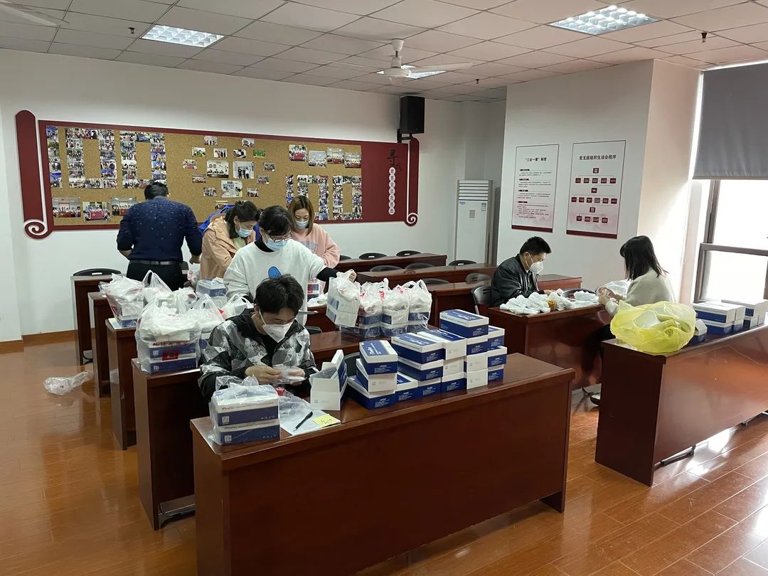 記者來到青園居委會了解到,為了保障居民自測安全順利進行,居委會根據居住總人數共領取了3900余份抗原檢測試劑盒,領取后迅速投入分發階段,積極號召黨員志愿者和樓組長配合分發派送,保證分發工作有序進行。