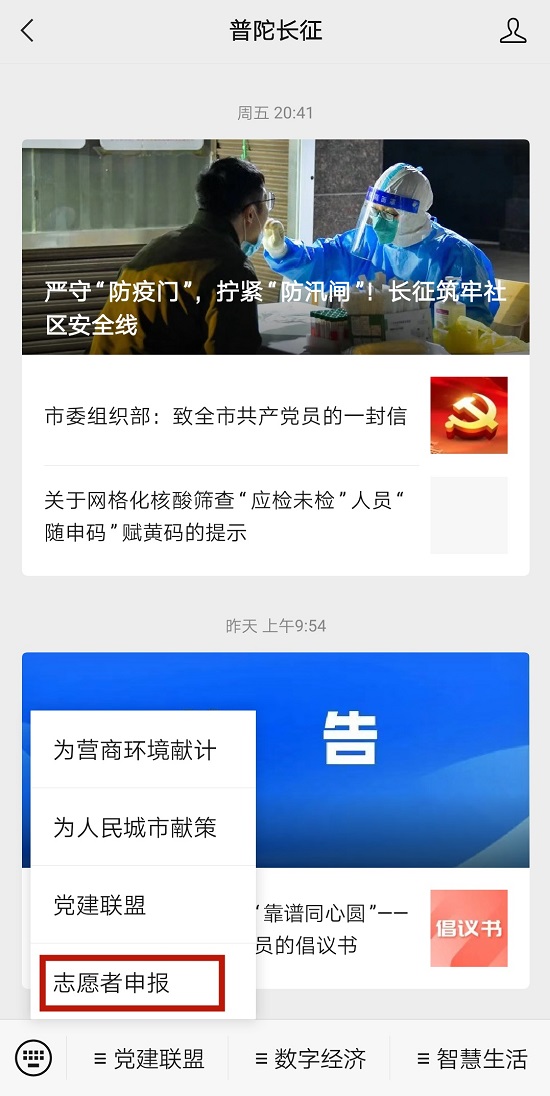 1、在“普陀長征”微信公眾號菜單欄點擊“志愿者申報”進入