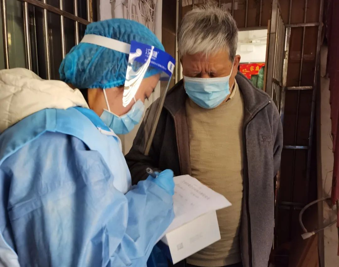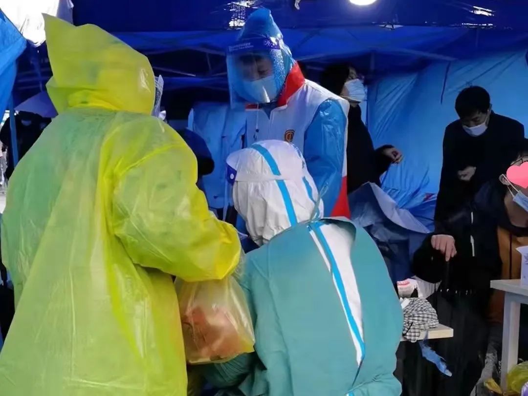 戴上口罩、穿上防護服、戴好防護面罩、套上橡膠手套,在“上崗”的時間里,來自區總工會的志愿者們顧不上吃一口飯、喝一口水,他們帶著耐心、細心敲開每戶居民的家門登記信息、發放抗原檢測試劑,為居民講解檢測流程,努力確保檢測“不漏一戶”“不漏一人”。