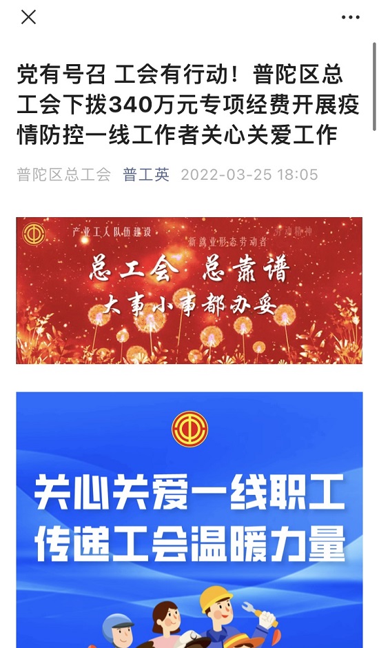 除了組織工會干部支援社區抗原檢測,普陀區總工會還積極做好防疫政策的宣傳員、弘揚正能量的示范員,不僅密切關注并宣傳權威渠道發布的各類信息、公告,還帶頭宣傳、點贊身邊的暖心故事,在普陀職工群體中凝聚起防疫的積極力量。