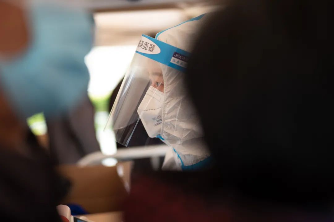 這位面罩上都是水汽的女士是青浦高級中學的老師。當天天氣回暖,防護服密不透風,等采樣工作結束時,里面的衣服都濕透了。她笑著對大家說,這樣的工作要多參加幾次就能減肥了。
