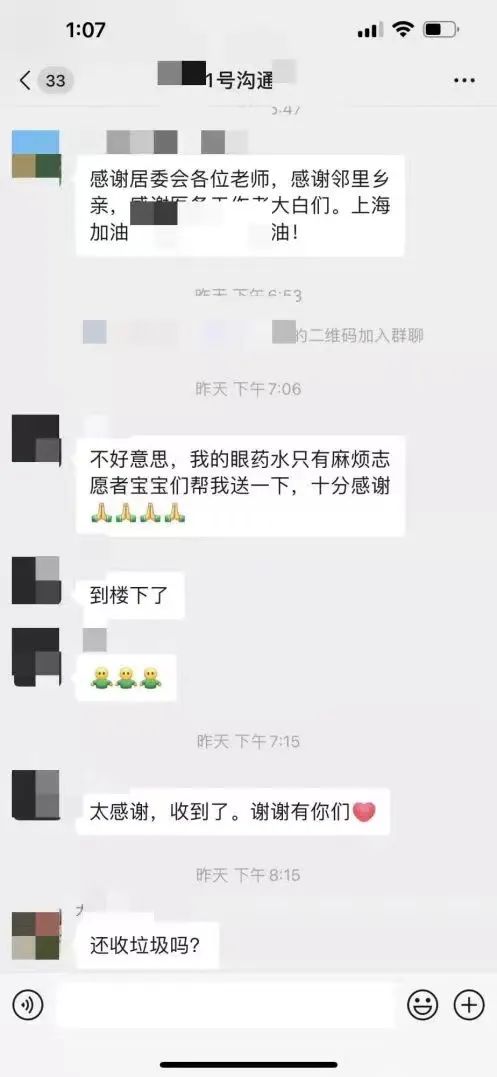 “不好意思,我的眼藥水只有麻煩志愿者寶寶們幫我送一下,十分感謝!边@是曲陽路街道汶水東路298弄被封樓棟溝通互助群里截取的日常。不到十分鐘,求助者家的門鈴響了,裝著眼藥水的袋子緊緊系在門把手上。
