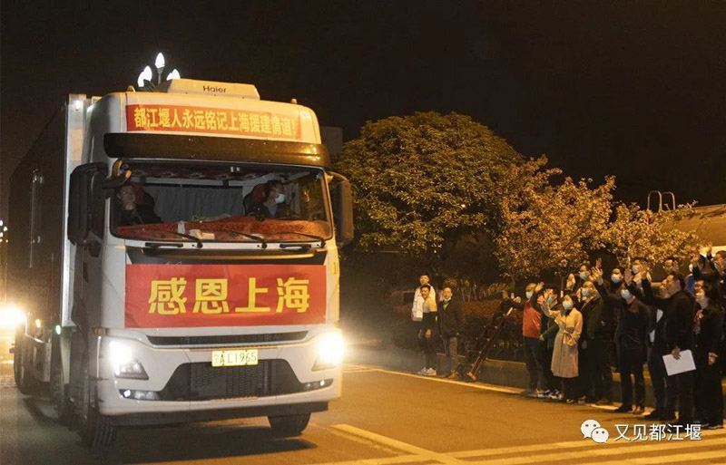 3月28日晚,十臺滿載著120余噸新鮮時蔬的貨運車輛,從都江堰集結出發開往上海。
