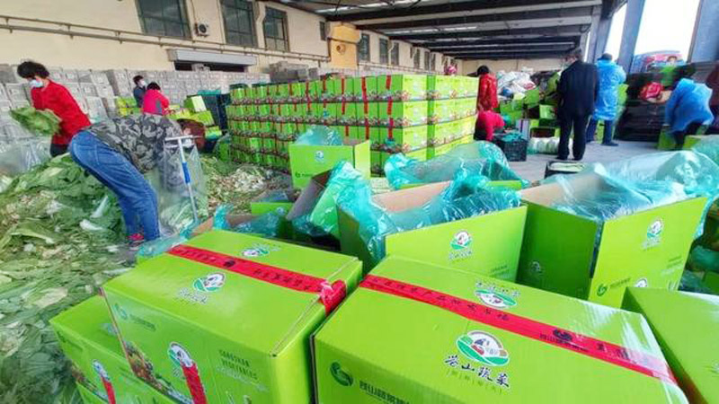 3月28日,上海市閔行區向山東臨沂市蘭陵縣提出采購20萬斤蔬菜需求。蘭陵縣立即組織縣內力量進行裝配。