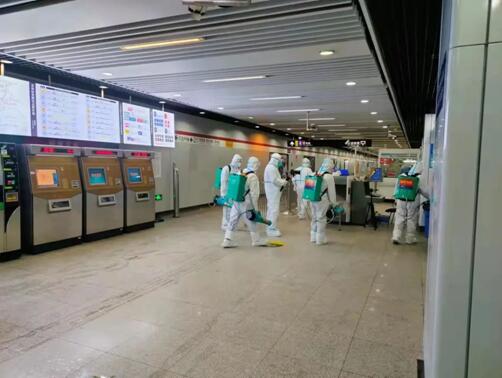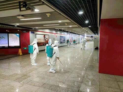 為提高效率,“前鋒部隊”兩兩一組,并排噴灑,一次作業范圍覆蓋整個路面。電梯上,他們背著40斤重的藥桶來回攀爬三層樓;平緩處,他們用雙腳丈量三萬平米;扶手、臺階、玻璃內側座椅、消防箱甚至是垃圾桶內側……他們一寸也不放過。