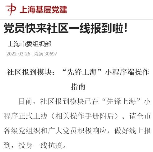 上海開展網格化核酸篩查和抗原檢測后,責任壓實到各個社區。為了在偌大的社區中有序開展相關工作,僅靠社區工作人員的力量還遠遠不夠,還需發揮黨組織的凝聚力和組織力,集結廣大黨員就地到社區報到。3月27日,號召發出后短短一天時間,大場鎮就有3613名黨員積極響應,通過"先鋒上海"小程序完成社區報到,并在協助抗原檢測、小區封控、服務群眾中當先鋒、做表率。