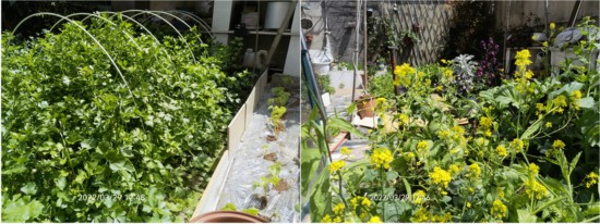 “最近好多人都抱怨吃不到綠葉菜,我家的綠葉菜反而不缺!崩闲熘钢鴪@子里隨風起浪的芹菜叢,還有開滿黃花的老青菜,笑得合不攏嘴。