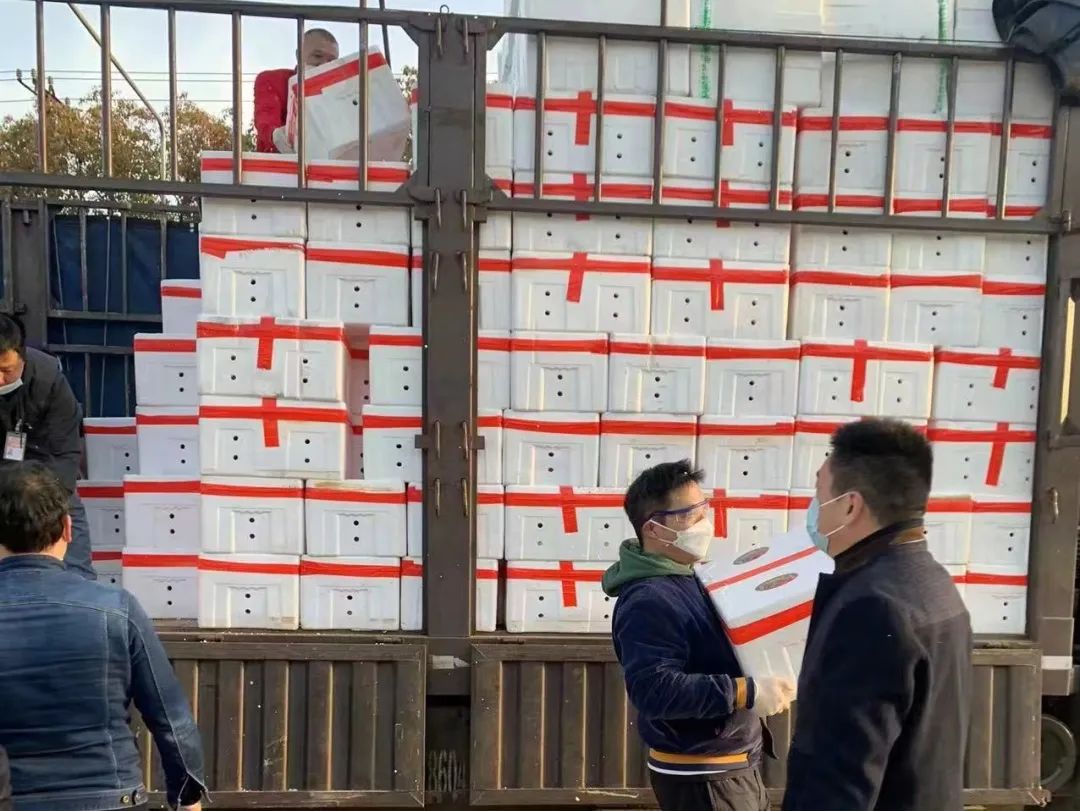 當晚8點多,整個場地上白色泡沫箱中裝滿了已分裝完畢的一袋袋蔬菜。這邊的打包工作剛結束,那邊就有車輛在等候把蔬菜裝上車,隨后機關工作人員化身為快遞小哥,派送工作旋即啟程。