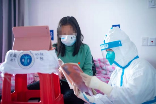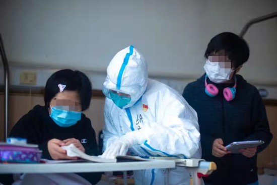 2號樓一間病室,住著學校風險人群篩查中發現核酸異常的4個女孩,沒有家人陪伴,醫生、護士主動當起老師,陪上網課、背課文、講解題目,帶去水果和零食。