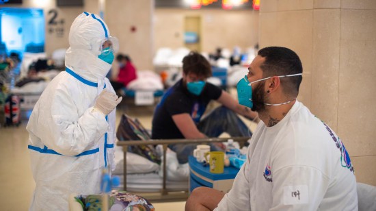 瑞金醫院北部院區,醫生在與住在隔離點的兩位外國人交流