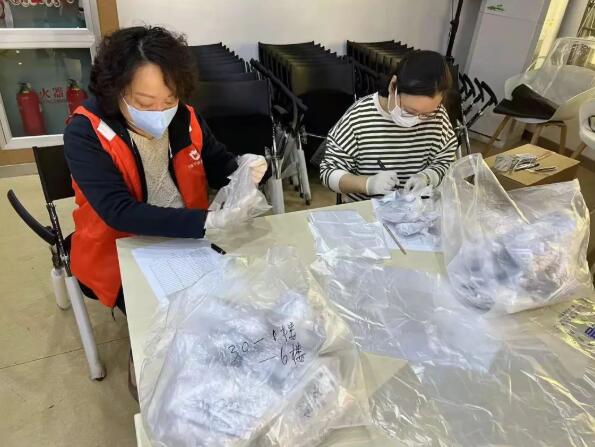 為保證抗原試劑發放不漏一戶、一人,志愿者們一遍又一遍地反復核對居民住戶信息;為避免人群聚集,志愿者們按照任務分工,一層層一戶戶地敲門、詢問、講解,確保試劑盒子送到每個居民的手中;有的志愿者還參與打包并配發防疫物資,為身處隔離的居民送去了一絲溫暖與關懷。