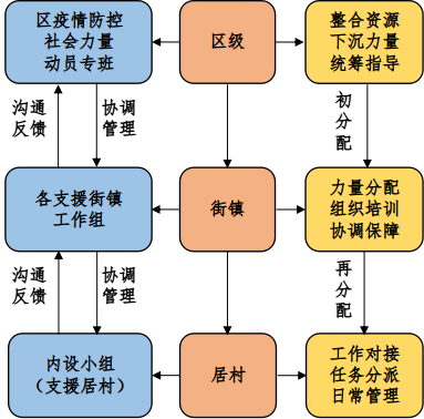 本次屬地工作組建立了三級組織管理體系,區級設總聯絡人,負責上下溝通協調,14個街鎮工作組分別由區委組織部選派有屬地工作經歷或屬地居住的處級領導干部擔任組長,明確工作職責,協助街鎮防控指揮部開展工作組指揮調度,并配備1名優秀科級干部擔任聯絡員,各居村設1名小組長,統籌本居村工作組力量,形成上下聯動、左右協同的組織管理體系。
