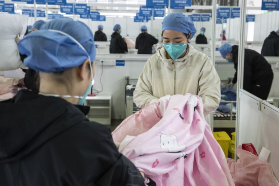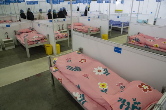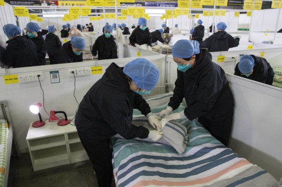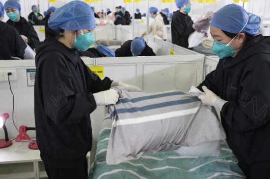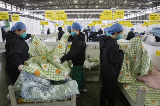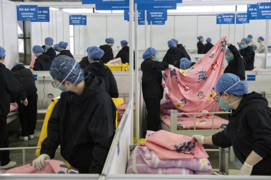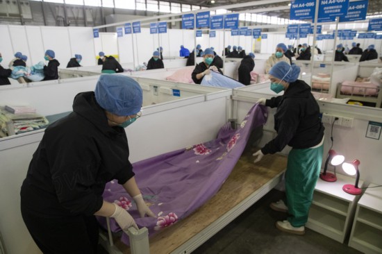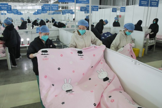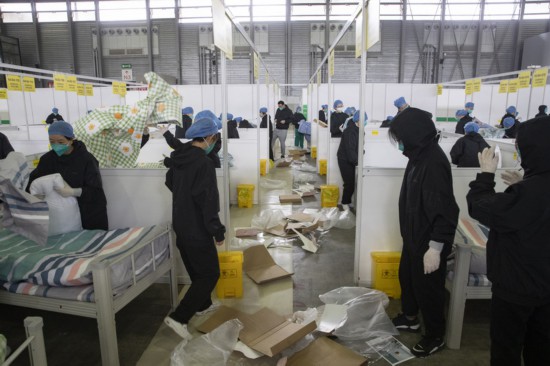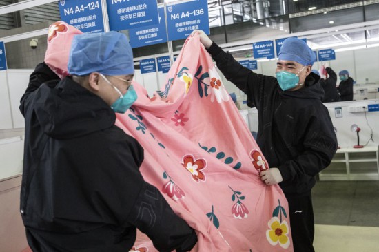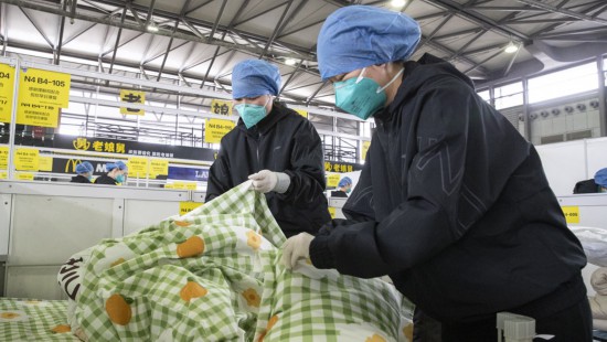上海最大集中隔離點作最后沖刺,醫療隊員抓緊套被套鋪床單