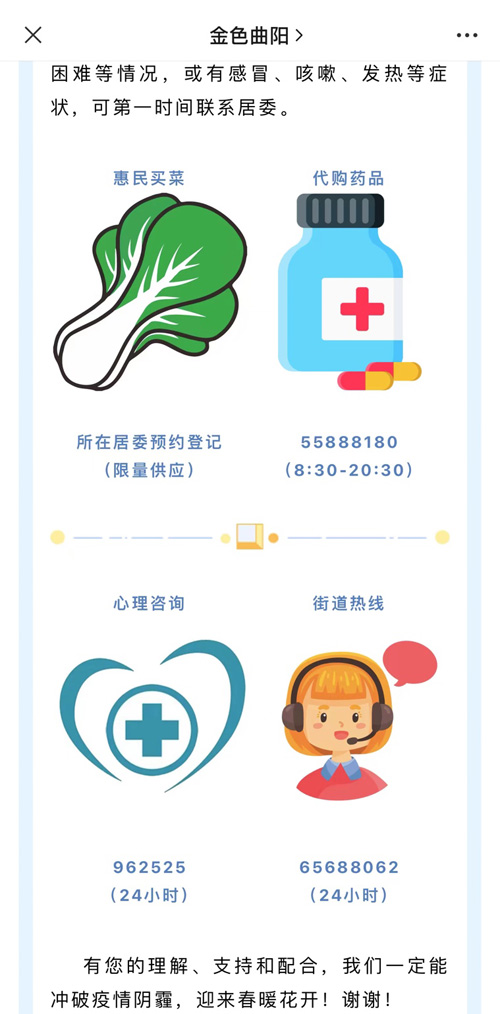 3月29日,曲陽路街道挨家挨戶向市民們發放了《告曲陽居民書》,文內詳細封控期間的時間安排,以及市民群眾的生活、就醫等注意事項,并提供代購藥品、惠民買菜、心理咨詢、街道熱點等服務。