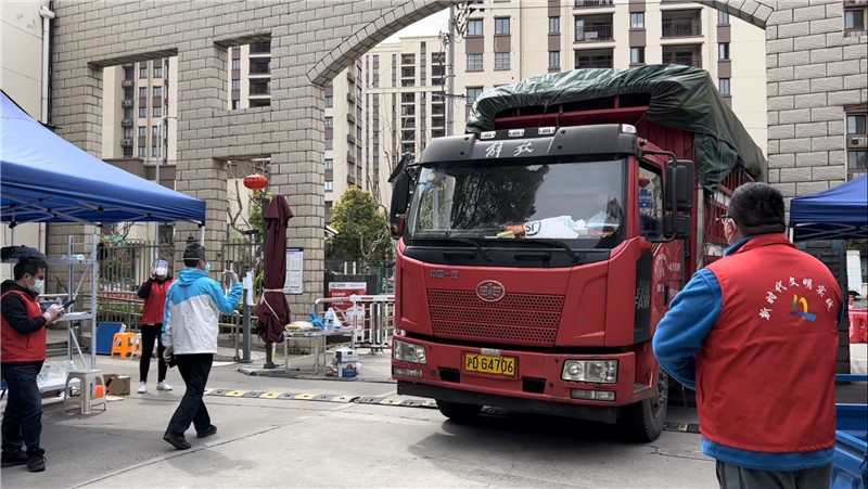 人民網上海4月1日電 (葛俊。笆卟藖砹!”4月1日上午10點13分,一輛滿載蔬菜的貨車駛進位于上海浦東新區曹路鎮的銀豐苑小區。忙碌著的志愿者們看到一大車的物資供給,頓時雀躍起來。