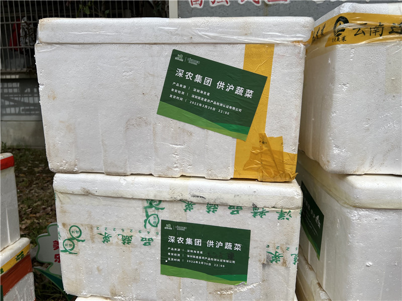 車停穩后,一箱箱新鮮的蔬菜被志愿者們接力抬下。箱體貼著“深農集團 供滬蔬菜”8個醒目的大字,于2022年3月30日22:00發出。蔬菜包有五種不同的套餐,包括土豆、洋蔥、白蘿卜、胡蘿卜、小椰菜、黃瓜等,共計850份。