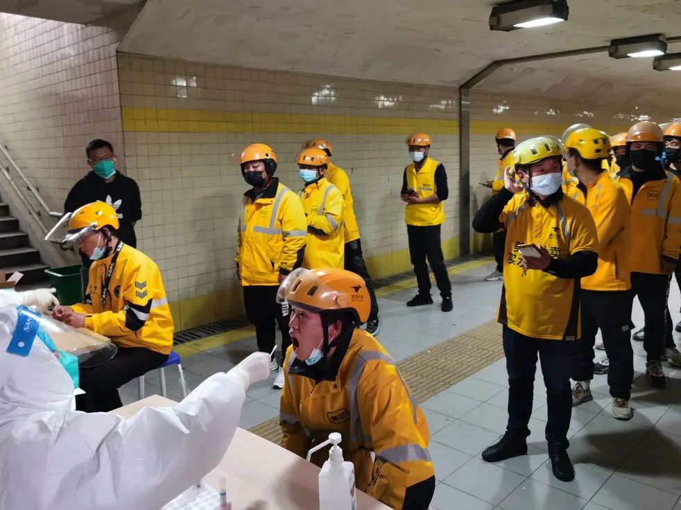 下午2點,在位于安波路上的美團外賣站點外,騎手們佩戴好口罩、有序排隊依次進行核酸檢測,來自附近站點的站長也趕到現場,對前來檢測的騎手進行引導。