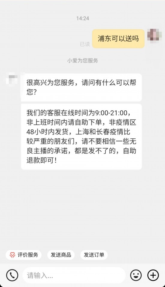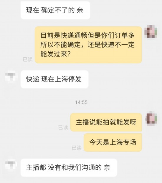 之后,記者又進入了其他直播間,也碰到了一些類似的情況。在與店家溝通時,甚至有客服直言“上海和長春疫情比較嚴重的朋友們,請不要相信一些無良主播的承諾,都是發不了的。自助退款即可!”