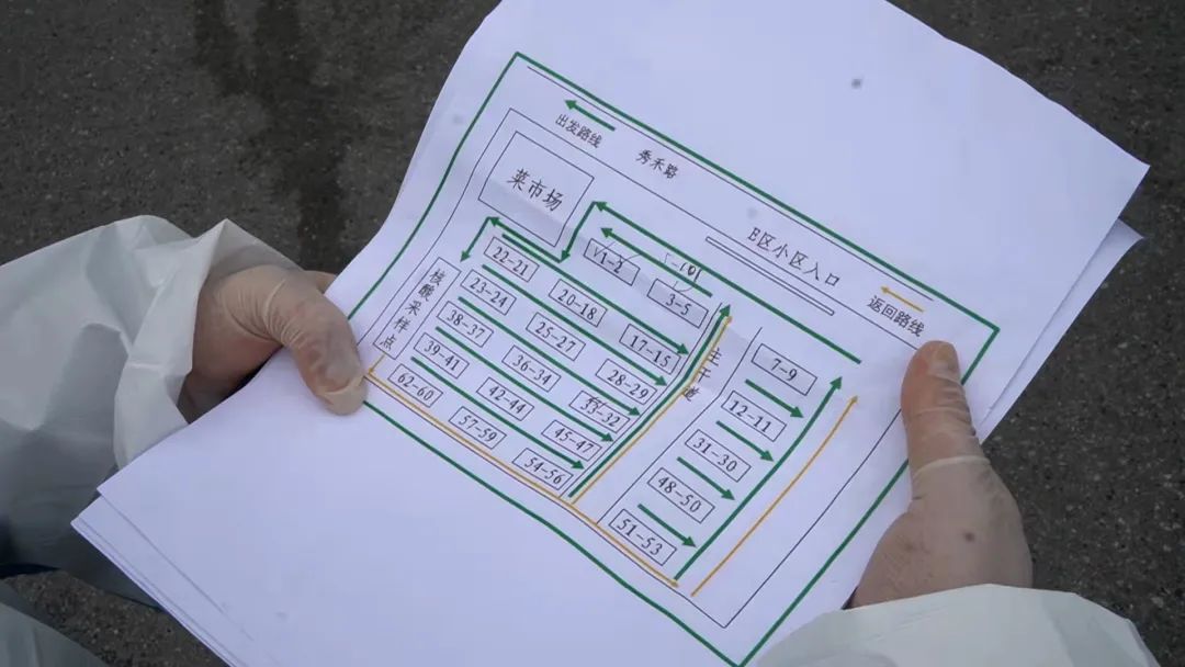 記者在青澤居委會看到,居民區書記和志愿者們人手一張畫滿箭頭的小區地形圖,上面仔細地標注了每個單元到檢測點的路線圖,由志愿者引導居民行進方向。有的樓出門是從左到右,有的是從右到左,就像設計交通動線一樣,盡可能讓不同樓棟的居民不要有交叉,減少感染風險。據了解催生這張“作戰路線圖”的首要原因,是小區的整體布局:4條主干道比較寬闊,中間的道路比較窄。為此,居民區黨支部書記談晶晶和同事們接到核酸檢測的通知后,就開始根據小區58棟樓、712戶的分布開始“畫地圖”。