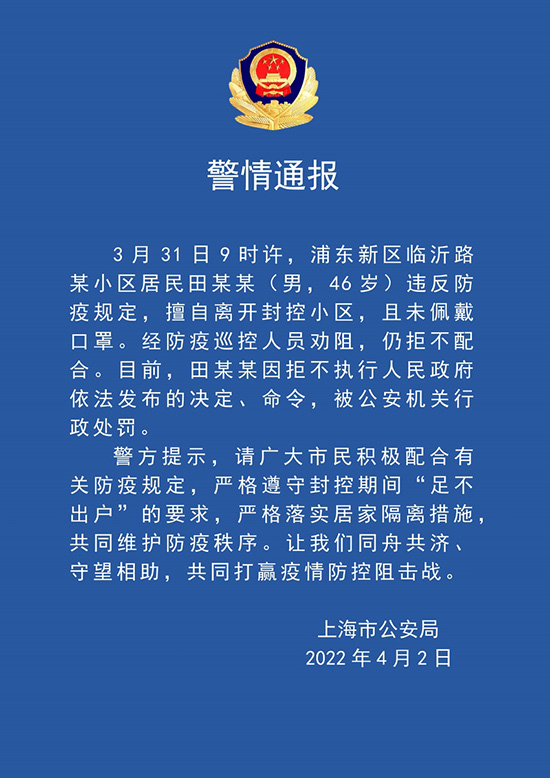 人民網上海4月2日電 (王文娟)據上海市公安局通報,3月31日9時許,浦東新區臨沂路某小區居民田某某(男,46歲)違反防疫規定,擅自離開封控小區,且未佩戴口罩。經防疫巡控人員勸阻,仍拒不配合。目前,田某某因拒不執行人民政府依法發布的決定、命令,被公安機關處以行政處罰。
