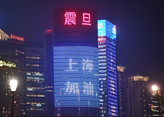 當晚東方網記者在上海外灘看到,小陸家嘴區域的上海中心大廈、中國金融信息中心、金茂大廈、花旗等樓宇亮起“上海加油,我們的心在一起”“我愛上!薄笆販覉@”等口號,為上海疫情防控鼓勁加油!
