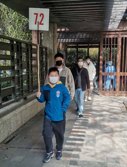 隊伍中,一名學生舉著樓道號碼的牌子走在前面,后面跟著一群人。