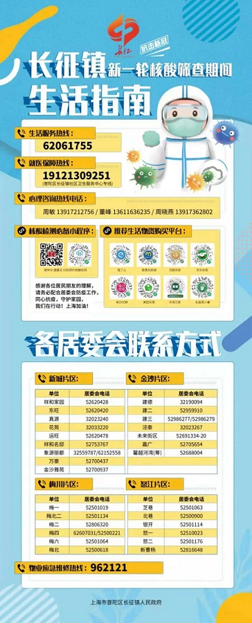 為將封控信息準確傳達給居民,長征鎮通過微信公眾號【普陀長征】第一時間發布《長征鎮關于嚴格落實封控管理期間人員足不出戶措施告知書》和《告長征鎮居民書》。同時,發布《長征鎮新一輪核酸篩查期間生活指南》,連夜發放至各居民區,努力讓信息跑在前,讓居民有充足時間做好封控準備。