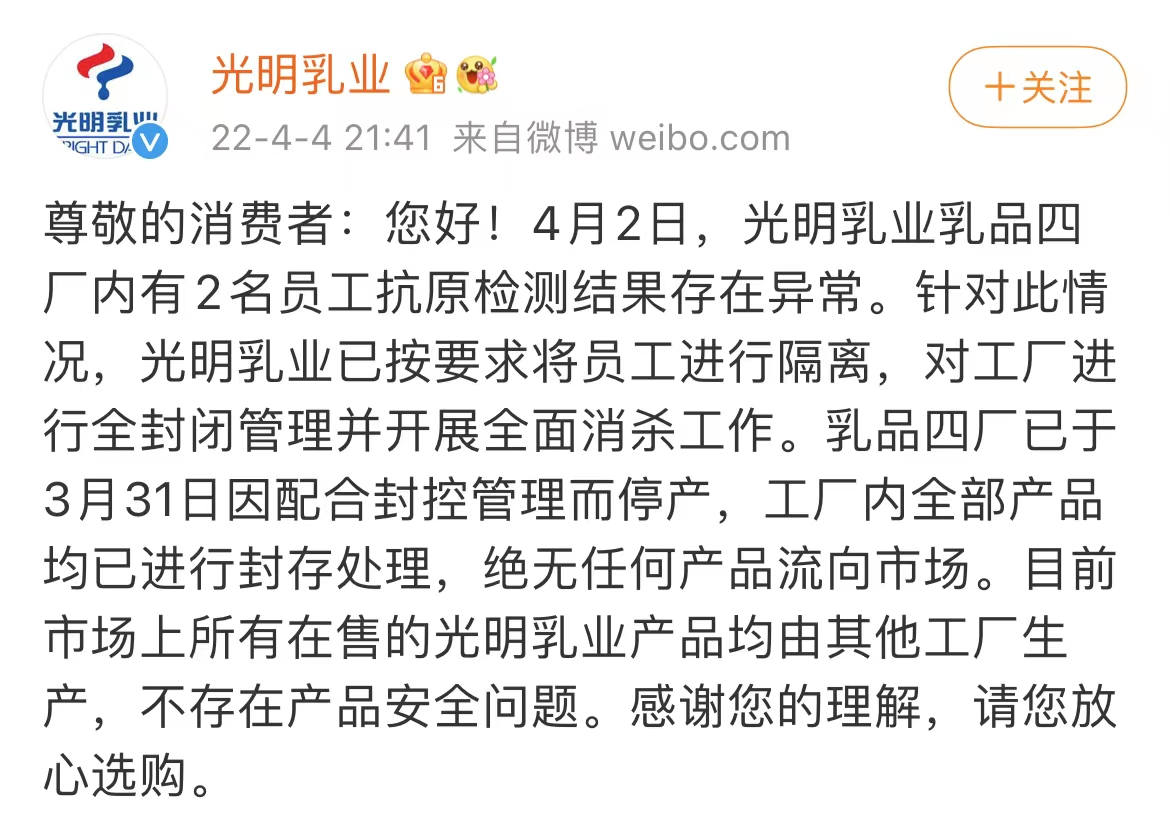 通告稱:4月2日,光明乳業乳品四廠內有2名員工抗原檢測結果存在異常。針對此情況,光明乳業已按要求將員工進行隔離,對工廠進行全封閉管理并開展全面消殺工作。乳品四廠已于3月31日因配合封控管理而停產,工廠內全部產品均已進行封存處理,絕無任何產品流向市場。目前市場上所有在售的光明乳業產品均由其他工廠生產,不存在產品安全問題。