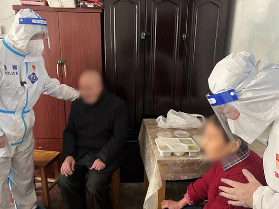 4月1日上午,浦西區域封控首日,曲陽路派出所民警董瑞在社區走訪時了解到周老伯和周阿婆是一對盲人老夫婦,平日生活飲食都是由家政人員負責,而封控后家政人員無法上門,老兩口的一日三餐就成了問題!敖^不能讓老人餓著”,董瑞心想,和所領導一番合計后,決定讓老兩口在派出所搭伙,每天安排人員將可口的熱飯菜送上門,不僅確保了營養,也讓兩位老人從飯菜的香味中倍感安心。