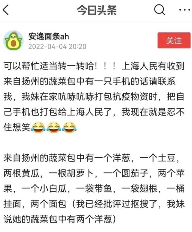 4月4日晚上,網友“安逸面條ah”在平臺發帖,代為尋找一位揚州馳援物資分揀員丟失的手機!鞍惨菝鏃lah”是這位物資分揀員的姐姐,據她描述,蔬菜包來自揚州,發往上海,她的妹妹王小姐在“吭哧吭哧打包物資“時不小心將手機也裝了進去,這份來自揚州的蔬菜包中有一個洋蔥、一個土豆、兩根黃瓜、一根胡蘿ト、ー個圓茄子、兩個蘋果、一個小白瓜、一袋帶魚、一袋翅根、一桶掛面和兩個面包。