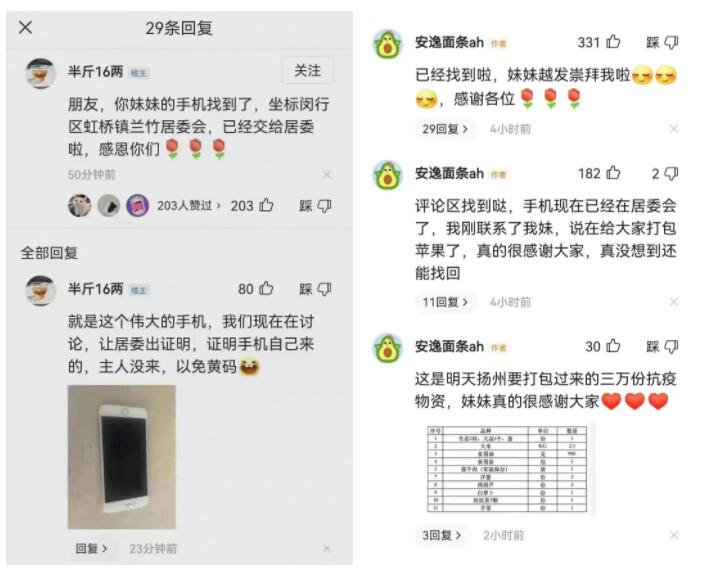 原來,這批物資被運送到了上海市閔行區虹橋鎮蘭竹居委的手里,虹橋鎮負責物資保障的部門對接了居委,居委又馬上把信息發到了業主群里。經過上海市民的熱情轉發,反饋信息很快來了,一名來自虹橋鎮龍柏四村的業主志愿者在門口清點物資時發現了這個似乎有聲音甚至還在顫動的蔬菜包,找到了其中的手機,緊接著這只手機被交給了居委書記。志愿者在原求助帖下方留言:手機找到了!坐標閔行區虹橋鎮蘭竹居委會。
