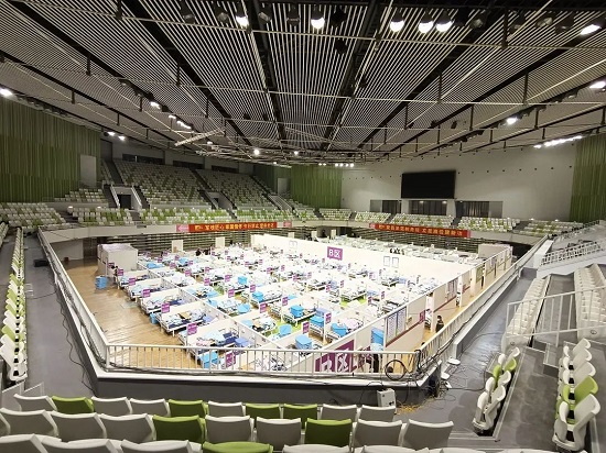 新啟用的青浦區方艙醫院設在青浦區體育文化活動中心,總建筑面積30878平方米,設置床位500張,使用地上1-2層,按標準開設呼吸內科、急診、外科、兒科和中醫科。護理病區設7個護理單元,有3個搶救區域。院內配備方艙CT、無創及有創呼吸機、除顫儀、心電圖機、可視喉鏡和過氧化氫消毒機等醫療設備。生活區內集中設置了淋浴區、盥洗區和飲用水凈水系統。每床位配備被褥、床頭燈、床頭柜和應急呼叫器等輔助設備及拖鞋、毛巾、牙刷、牙膏和衛生紙等生活用品。