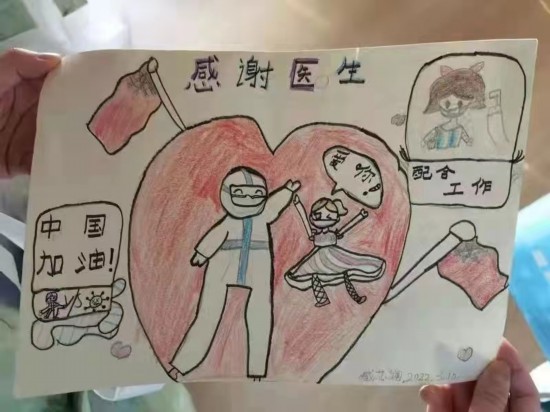 4月1日,護士勞澤翊也在采樣時收到了一個小女孩悄悄從背后遞上來的一幅畫,女孩說:“謝謝你們,辛苦了!”這天趕上倒春寒,勞澤翊戴了兩層手套的手指也已僵硬,但目送小女孩一家人離開,一股暖意在她心中涌起。