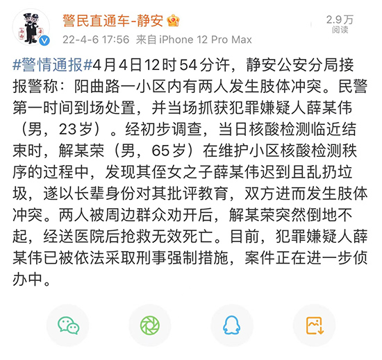 人民網上海4月6日電 (王文娟)據“警民直通車-靜安”通報,4月4日12時54分許,靜安公安分局接報警稱:陽曲路一小區內有兩人發生肢體沖突。民警第一時間到場處置,并當場抓獲犯罪嫌疑人薛某偉(男,23歲)。經初步調查,當日核酸檢測臨近結束時,解某榮(男,65歲)在維護小區核酸檢測秩序的過程中,發現其侄女之子薛某偉遲到且亂扔垃圾,遂以長輩身份對其批評教育,雙方進而發生肢體沖突。兩人被周邊群眾勸開后,解某榮突然倒地不起,經送醫院后搶救無效死亡。目前,犯罪嫌疑人薛某偉已被依法采取刑事強制措施,案件正在進一步偵辦中。