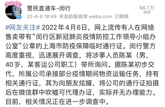 人民網上海4月6日電 (王文娟)據“警民直通車-閔行”通報:2022年4月6日,網上流傳有人在網絡售賣帶有“閔行區新冠肺炎疫情防控工作領導小組辦公室”公章的上海市防疫保障臨時通行證。閔行警方高度重視,迅速展開調查,將涉事人員陳某(男,40歲,某客運公司職工)帶所詢問。據陳某初步交代,所屬公司承接部分疫情期間物資運輸任務,持有相關通行證,其為向朋友炫耀,將公司的通行證拍攝后在微信群中吹噓可代理辦證,實際并無辦理能力。目前,相關情況正在進一步調查中。