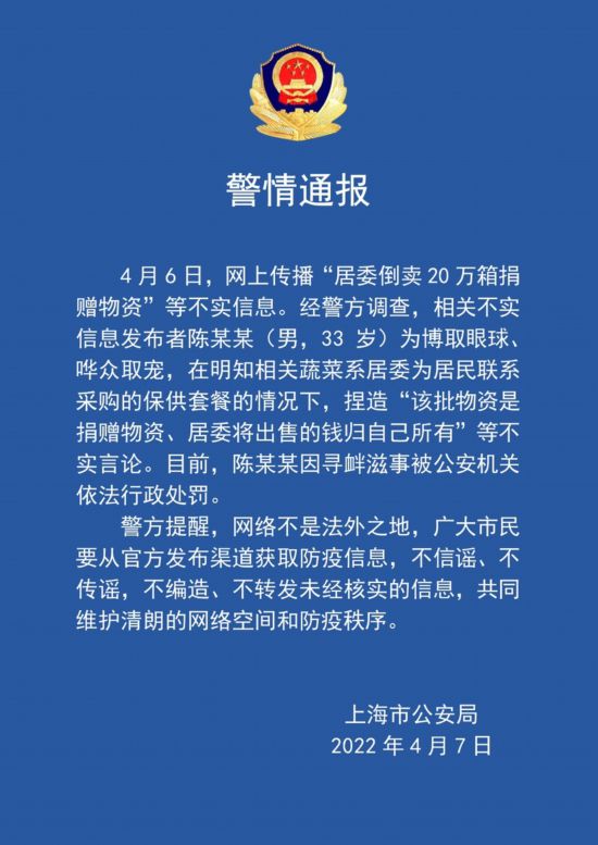 4月6日,網上流傳著“居委倒賣20萬箱捐贈物資”等不實信息。經上海警方調查,相關不實信息發布者陳某某(男,33歲)為博取眼球、嘩眾取寵,在明知相關蔬菜系居委為居民聯系采購的保供套餐,卻捏造成“該物資是捐贈物資、居委將出售的錢歸自己所有”等不實言論。目前,陳某某因尋釁滋事被公安機關依法行政處罰。