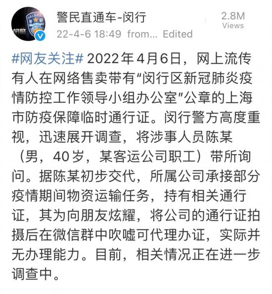 據上海警方通報,2022年4月6日,網上流傳有人售賣帶有“閔行區新冠肺炎疫情防控工作領導小組辦公室”公章的上海市防疫保障臨時通行證。公安機關迅速展開調查,抓獲違法行為人陳某(男,40歲,閔行區某客運公司職工)。