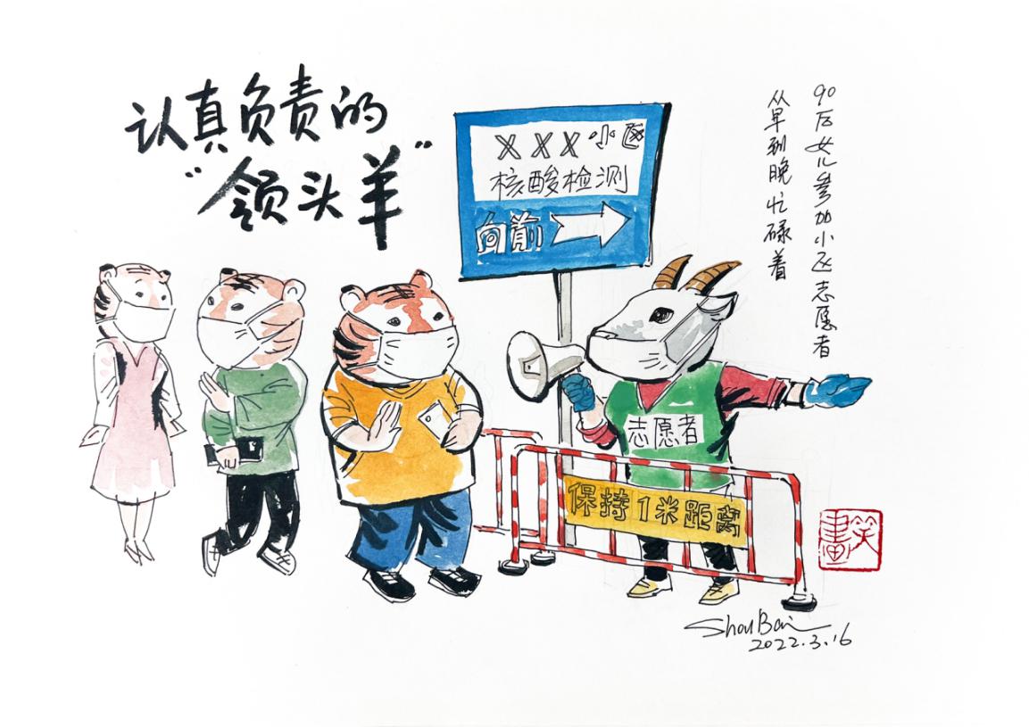 疫情期間,居家隔離期間,藝術家李守白和妻子、女兒朝夕相對,以此為靈感創作了“虎爸、兔媽和羊女”的日常生活系列漫畫。只見虎爸化身藝術大廚,每天為妻女下廚;兔媽居家做家務,保障內勤;羊女則積極在社區內當志愿者,配合大白做核酸檢測……這不正是當下各小區隔離封控生活的真實寫照嗎?最后李守白還不忘用綠“馬”祝福大家:“通通是綠碼”。
