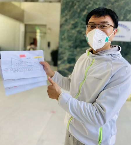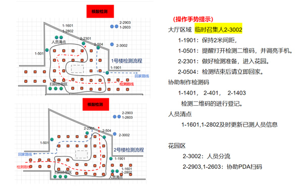 據了解,泰榮苑的樓層比較高,每號樓都有30層,每層3到4戶人家?紤]到在疫情期間,高樓層住戶乘坐電梯下樓時可能會出現人群擁擠的情況,在核酸檢測的前一晚,張院長和他的愛人一起設計出了核酸檢測“路線圖”以及人群引導卡片。第二天還在大廳內貼上了引導地貼,用于人群分流,并且修改了電梯乘坐流程。