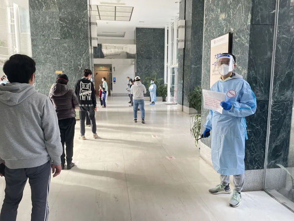 “1號樓5樓的住戶請跟我走樓梯下樓,6樓的住戶請跟我乘電梯下樓!痹缟6點半,對照著核酸采樣登記表上的住戶信息,泰榮苑核酸檢測采樣志愿者按照提前規劃好的路線,引導住戶們下樓站到指定的地點,逐一登記。