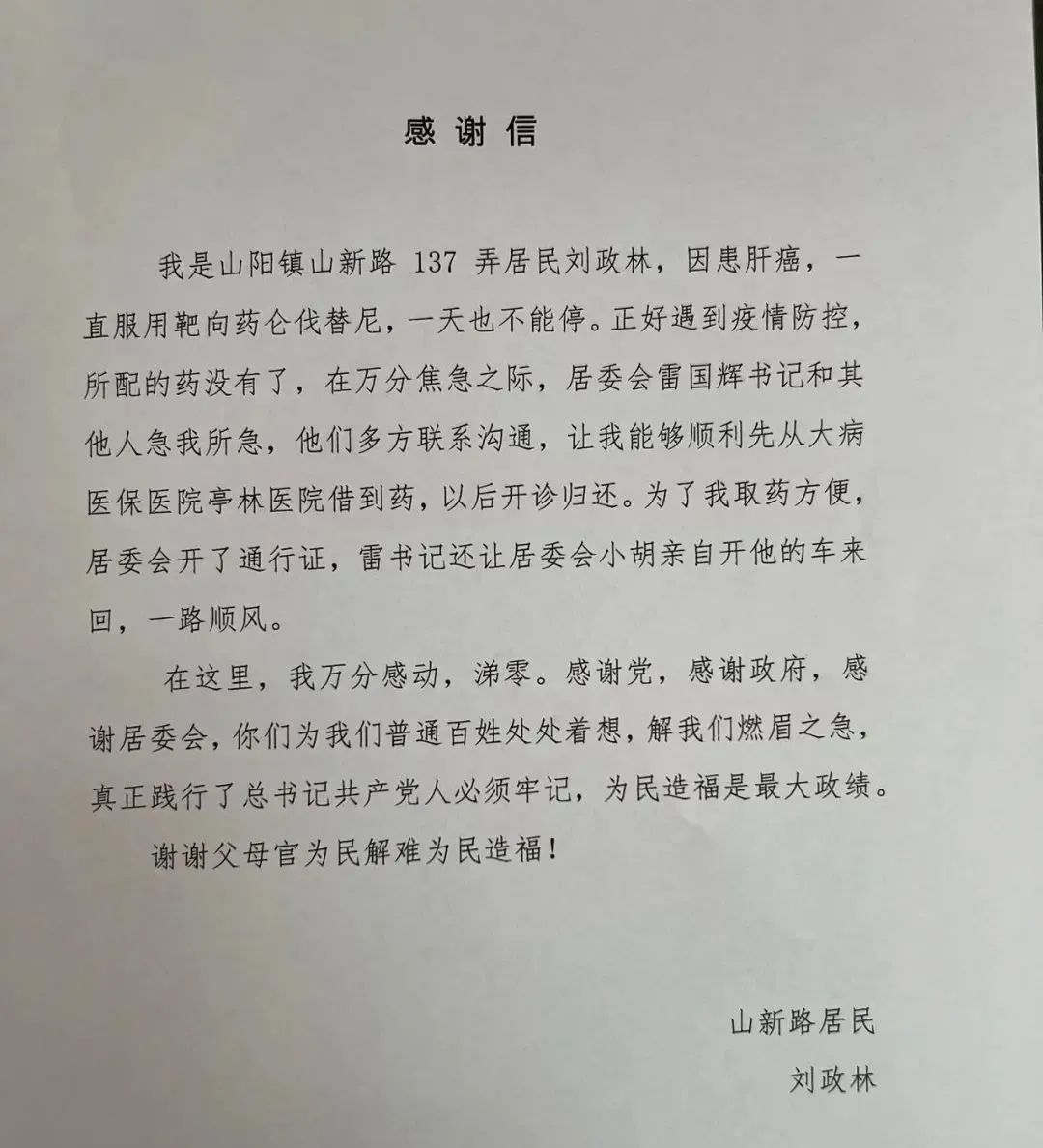 家住金山區山陽鎮山新路137弄居民劉政林,終于在區、鎮有關部門和居委會干部的大力協調下,配到了靶向藥侖伐替尼1盒,家里僅剩一粒藥的他,懸著的一顆心終于放了下來,一個勁地感謝山新居民區黨總支書記、居委會主任雷國輝。