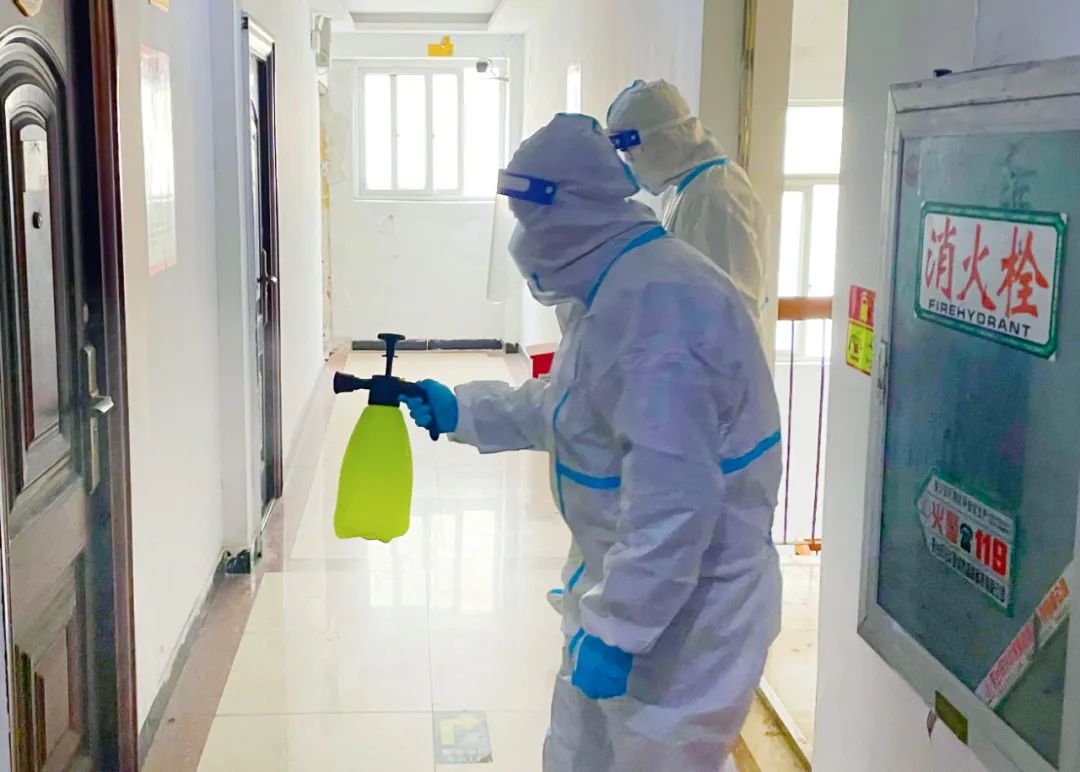 “注意安全,做好消毒消殺!”在穿好防護服、戴好口罩、手套后,朱涇鎮金朱環衛的環衛工人陳南和搭檔宋林金駕駛著垃圾清運車駛入了有封控樓棟的小區,兩人熟練地用隨身攜帶的消毒藥水,對居家隔離居民放置在門口的垃圾及周邊場地進行消毒消殺,隨后將垃圾運至車上。一棟樓一層層清運完,再換一棟繼續爬樓梯,一天里,陳南和宋林金要上上下下無數遍,脫下防護服時,里面的衣服早已被汗水濕透。
