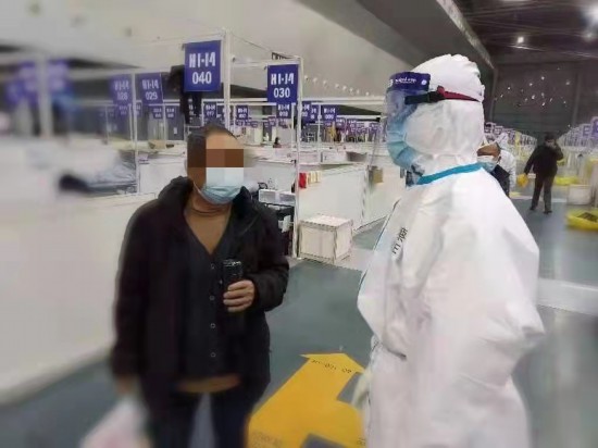 “您先回床鋪不要走動,我去幫您解決!睏钕榈谝粫r間找到了收治點內的工勤人員,緊急協調了一張小方桌。由于穿著厚重的防護服行動不便,楊祥和同事一步一步、小心翼翼地將方桌從遠處搬到男孩身旁。孩子母親連聲道謝。