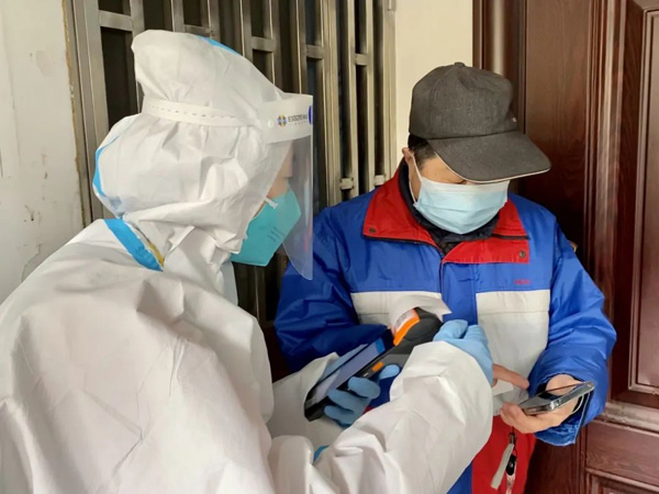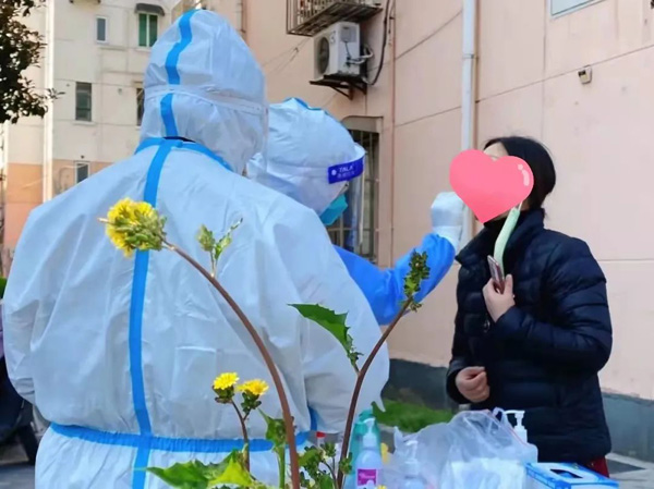 當天的核酸檢測工作快要結束時,我在一旁整理還未用完的防疫物資,看到幾朵春花開得正艷,忍不住拿起手機拍了張照片。定格的畫面里,是黃澄澄的花、正在采樣的醫生、細心協助的志愿者,和摘下口罩前不忘說一聲“謝謝”的居民。