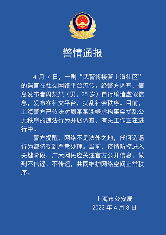 人民網上海4月8日電(王文娟)據上海市公安局通報:4月7日,一則“武警將接管上海社區”的謠言在社交網絡平臺流傳。經警方調查,信息發布者周某某(男,35歲)自行編造虛假信息,發布在社交平臺,擾亂社會秩序。目前,上海警方已依法對周某某涉嫌虛構事實擾亂公共秩序的違法行為開展調查,有關工作正在進行中。