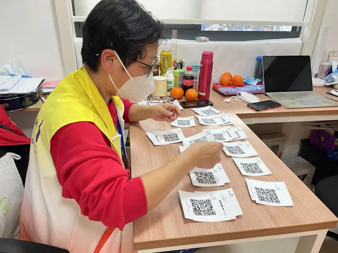 趙家花園居民區老齡化程度較高,為在封控期間做好對老年群體的特殊關懷,保障他們的生活便利與安全,趙園居委會下足了功夫。每次做核酸檢測前一晚,居委工作人員會把60歲以上老人的核酸檢測二維碼給提前打印出來。在第二天的核酸檢測工作開始前,及時分發到這些老年人手中。
