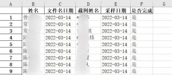 為此,他想到了Python語言中的正則表達式——可以搜索到字符串中的特定模式內容!笆褂谜齽t表達式就可以把想要的信息從OCR識別的文本中篩選出來。最后,確認好每張截圖里的姓名、檢測時間和是否已采樣等信息后,再把所有人的結果輸出到Excel文件中,方便人工確認!