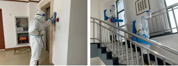 隊員們拿著高壓消毒噴嘴,對住宅樓棟的走廊、樓梯、墻壁等公共區域全方位無死角消殺,還會用毛巾對電梯按鈕、門把手等重點區域進行擦拭,確保對周邊環境的全覆蓋消毒。